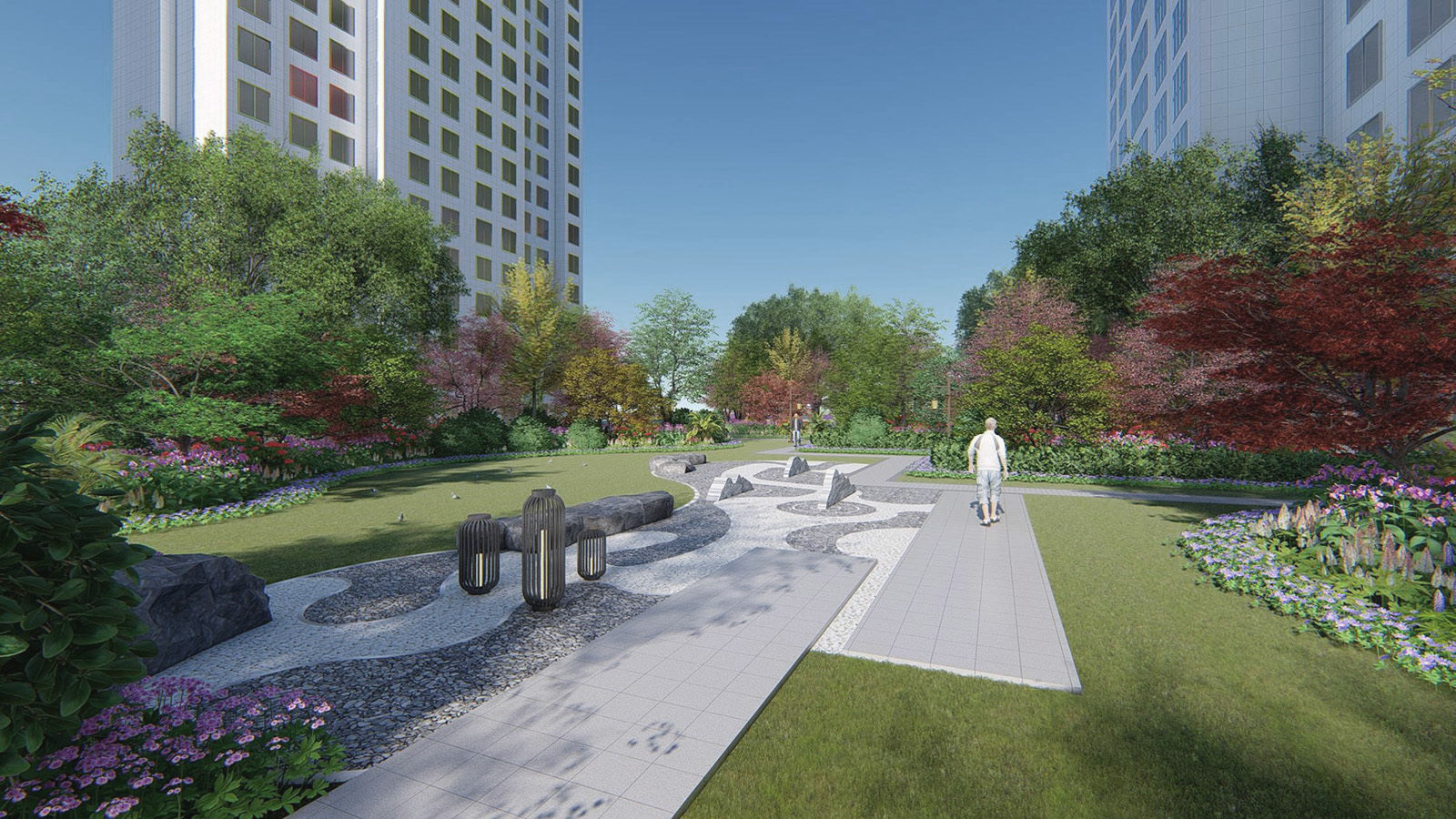 以新中式簡約設(shè)計手法描繪出完美的幸福社區(qū)生活氛圍,滿足全齡段不同業(yè)主的生活功能需求,依據(jù)幸福主題,對不同區(qū)域的組團賦予不同的主題功能,打造三大地塊五大幸福主題花園盛景。