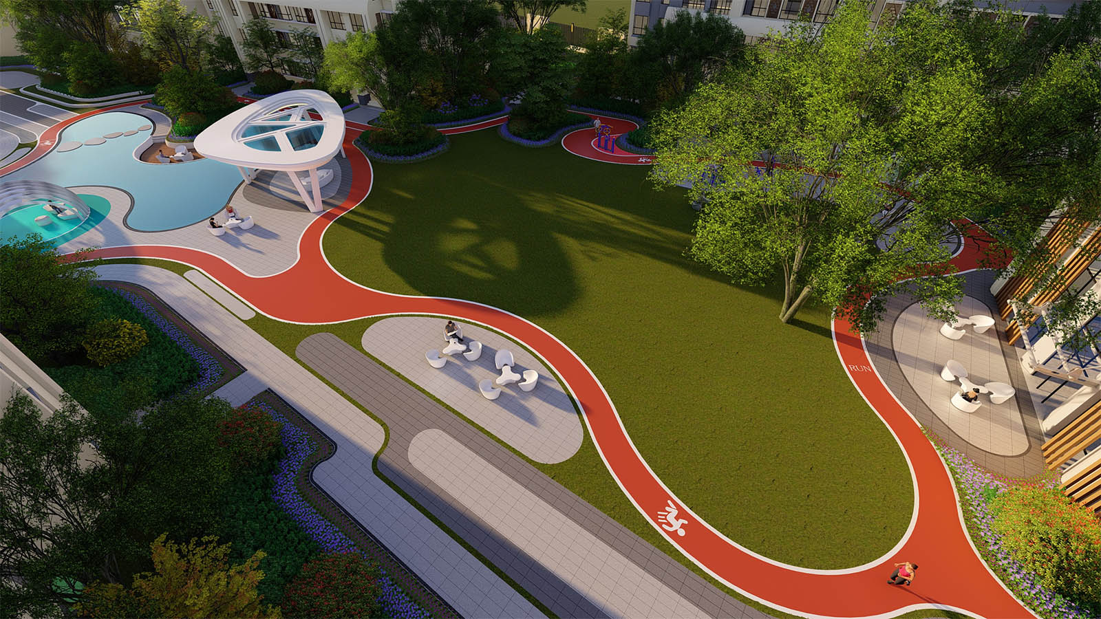 優雅靈動的線型、簡潔純凈的色彩語言,富有韻律的構圖和曲線形式,表達各生活功能區之間相互依纏的空間關系,線條柔和,以曲線構成使的場地更具延展性,采用環繞式的手法體現出溫潤與舒適的人居氛圍。