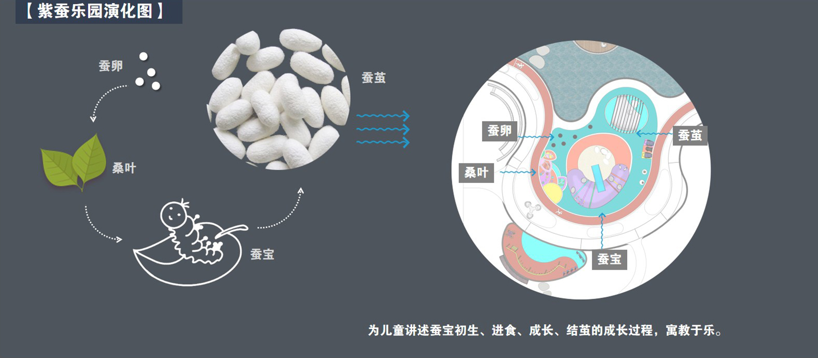 紫蠶兒童主題樂園以蠶寶寶的生長演變過程為設計思路,整個樂園區域設計特別吸引眼球的是以“紫蠶”為主題形象創作的趣味鉆洞滑梯;