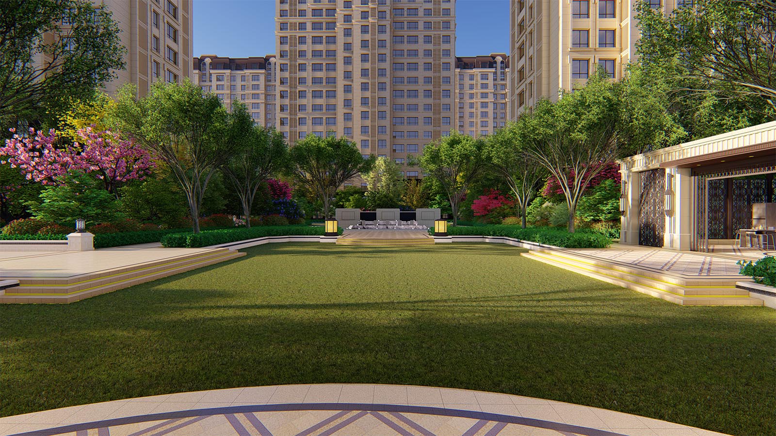 古典的中軸線配合精致的線腳,形式精美又富有力量,前廣場門頭雍容華美,入口對景層層疊疊水景精致動人,引人入勝。