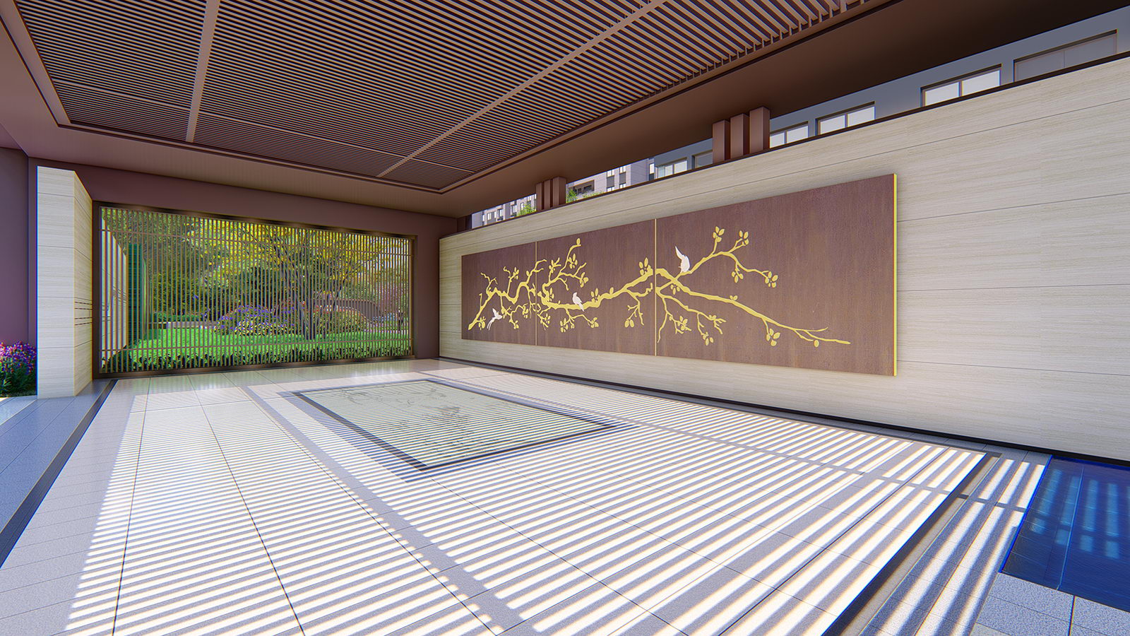 門頭對景處設(shè)置“喜上眉(梅)梢”景墻,客戶視線跟隨梅花枝條方向延伸,巧妙構(gòu)建空間遞進(jìn)關(guān)系,為項目增添趣味及內(nèi)涵。