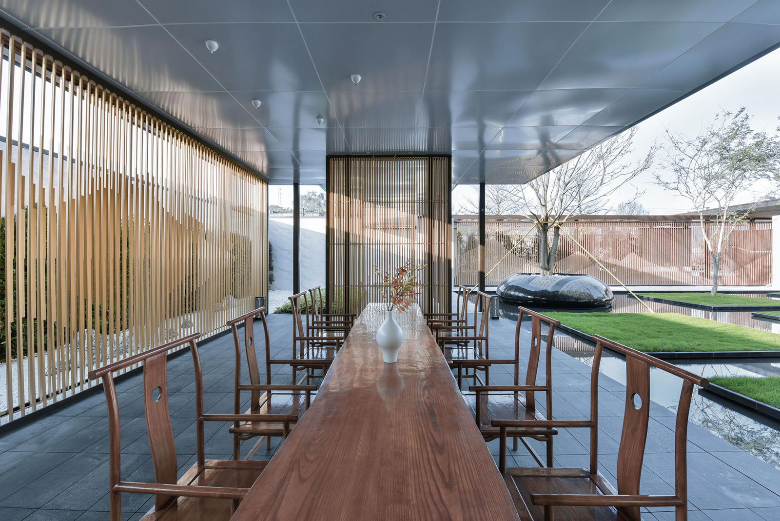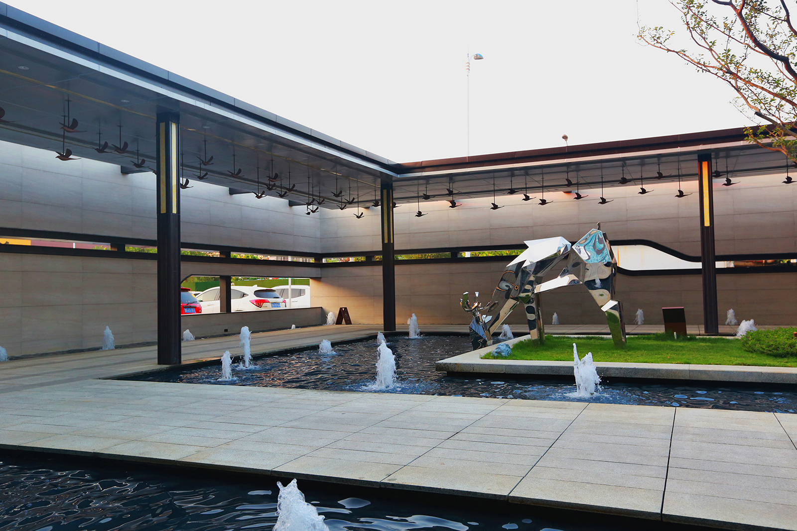 “L形”廊架給予客戶無形的引導(dǎo),帶領(lǐng)客戶進(jìn)入到更深層次空間,廊架頂板布置喜鵲藝術(shù)裝置,以雀幸喜歸為主題,引導(dǎo)賓客進(jìn)入售樓部。